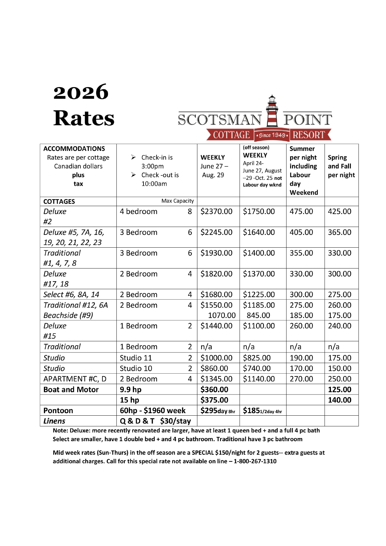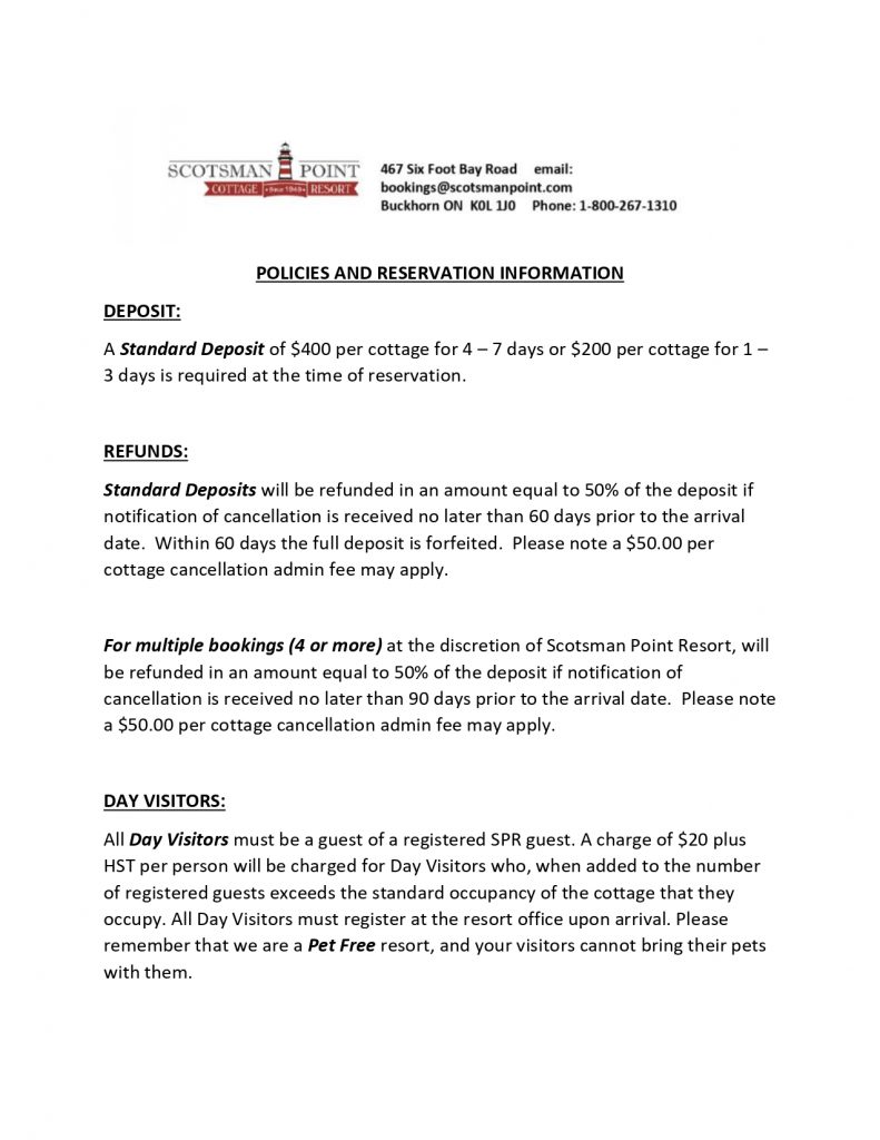 Home>Cottages> COTTAGE RENTAL Click here for 2026 Accommodation Rates at a Glance Click here for Policies and Reservation 4 BEDROOM DELUXE COTTAGE This cottage has a great lake view and overlooks the beach 2 BEDROOM DELUXE Our newly renovated cottages on the far shore have lovely lake views 1 BEDROOM DELUXE Located on the point, great views of the lake...perfect for a romantic getaway! 3 BEDROOM DELUXE COTTAGE Watch the sunrise over Buckhorn Lake from your 3 Bedroom Deluxe cottage 2 BEDROOM SELECT COTTAGE Newly renovated and close to the lake - lovely! STUDIO CABIN 10 With a small screened porch and beautiful views of the lake 3 BEDROOM TRADITIONAL COTTAGE Facing the lake these cottages have great views! 2 BEDROOM TRADITIONAL COTTAGE Facing the lake and the beach area of the resort STUDIO CABIN 11 Everything you need in one room! Close to the lake and all the action. 2 BEDROOM APARTMENT Set back from the lake with screened porches with views of the grounds and the lake 1 BEDROOM TRADITIONAL COTTAGE Set back on the resort. Privacy and partial lake view COTTAGE MAP Learn More Your Ontario Cottage is waiting! call us at 1-800-267-1310. Plans are in place for an exciting year here at Scotsman Point...make sure you secure your spot for 2025!!! ONLINE BOOKING